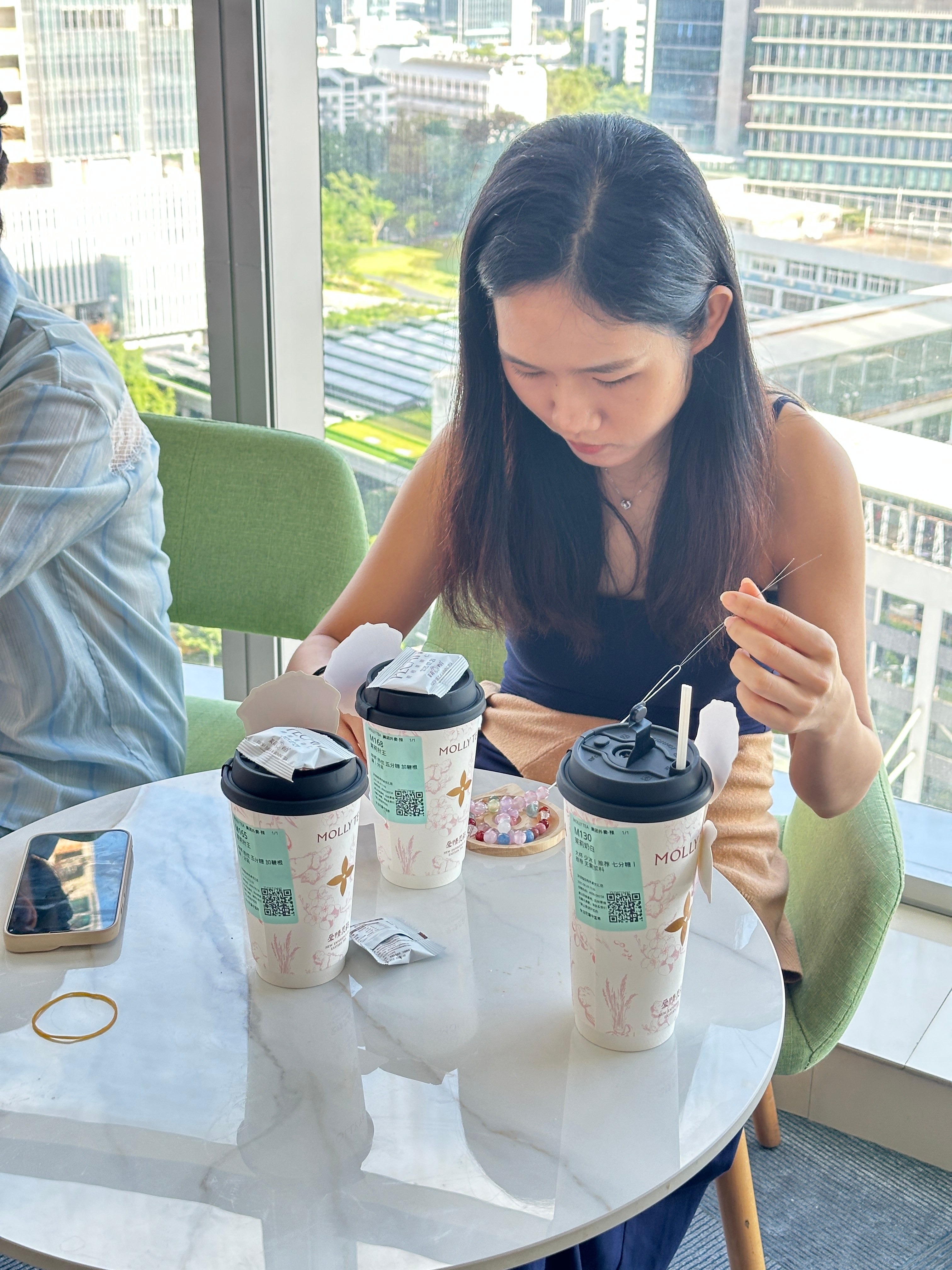 伴随着活动的进行,大家纷纷投入创作,自由挑选心仪的配珠与线材,巧妙搭配、精心编织。在欢声笑语中大家不仅放松了身心,更深化了彼此默契。