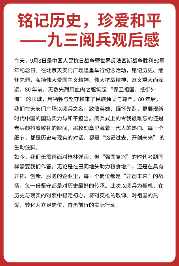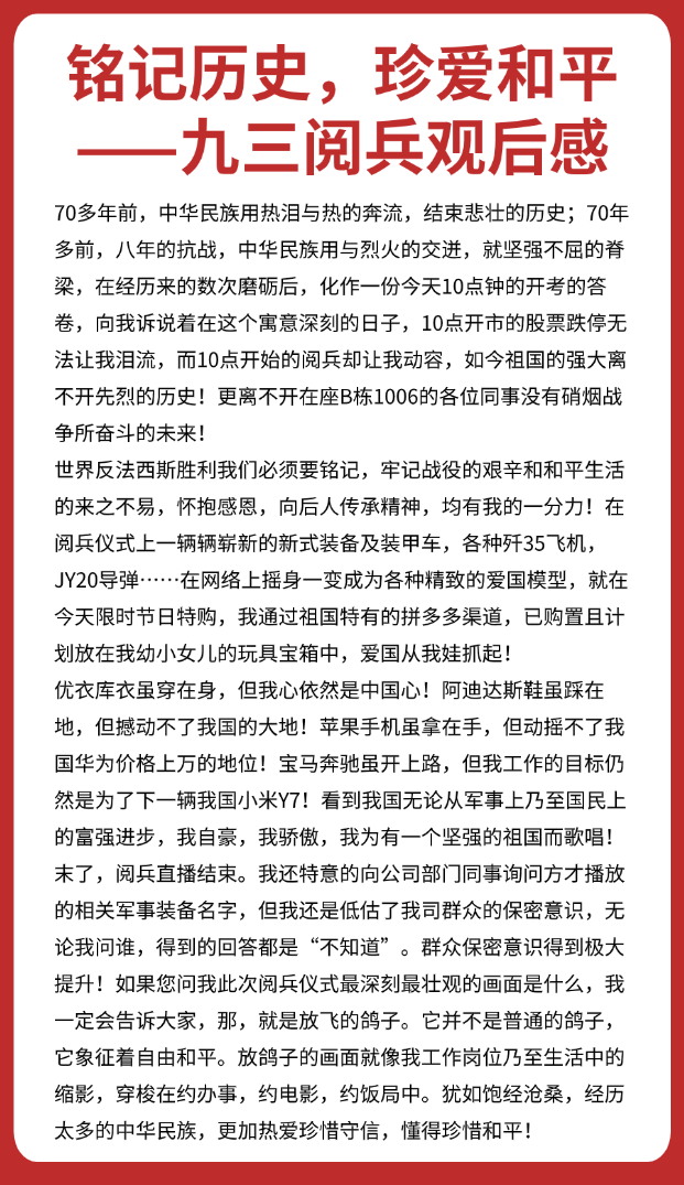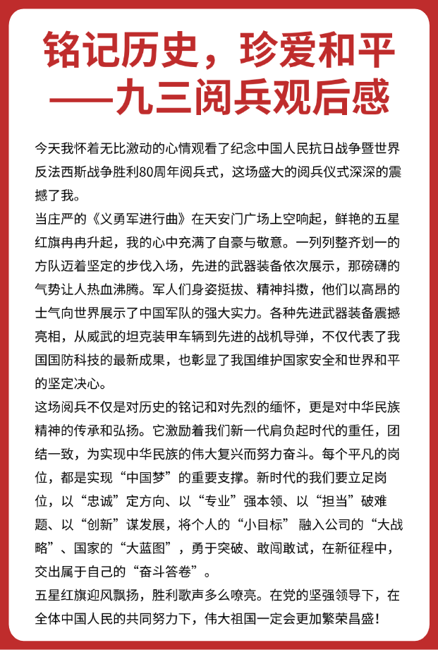 企业发展与国家发展密不可分,员工成长与企业进步相辅相成。这次集体观看阅兵活动,是一次爱国主义教育的实践,也是增强团队凝聚力和企业文化建设的重要契机。为此,我们特别开展了观后感征集活动,以下是其中3位同事的投稿: