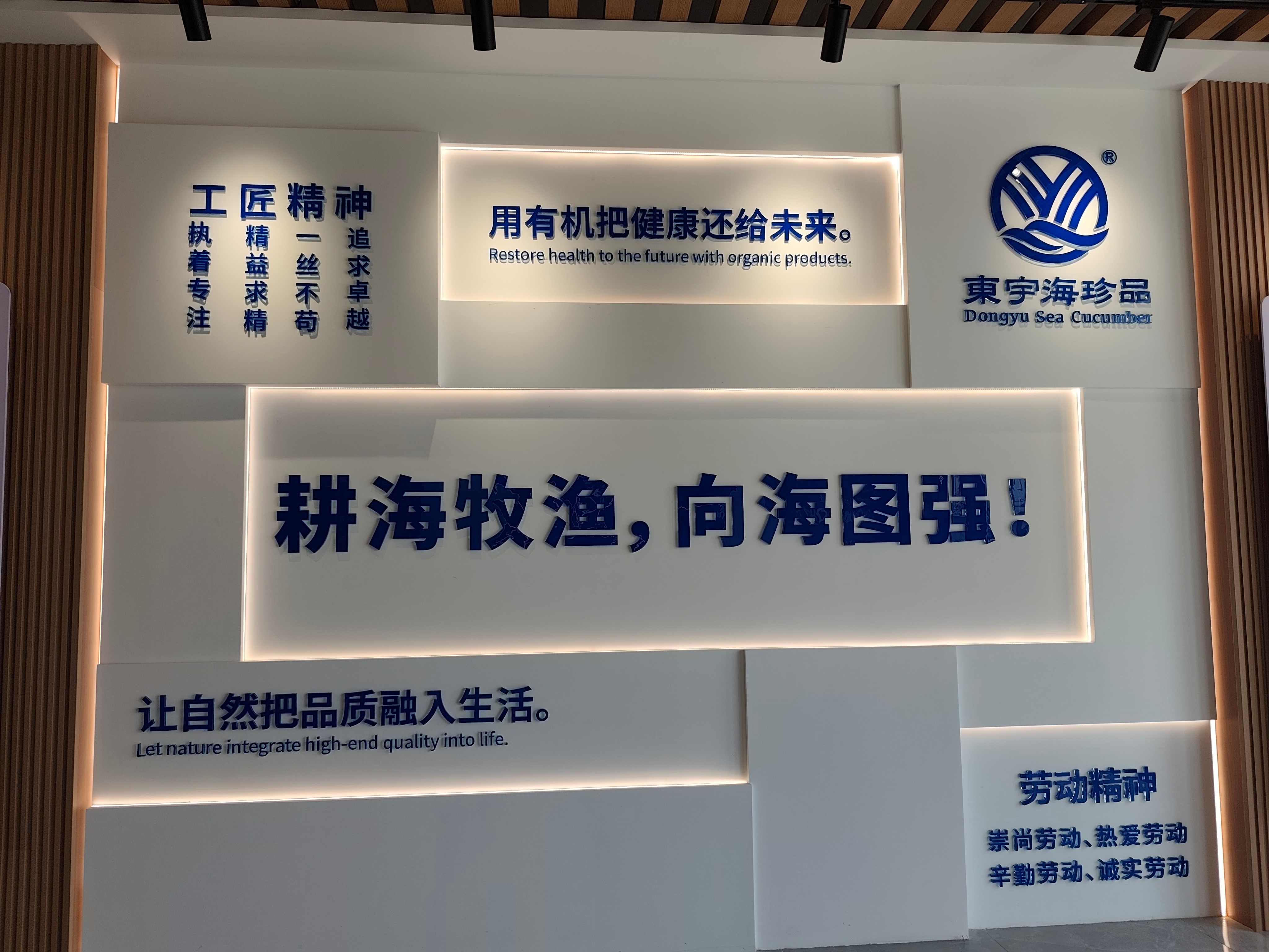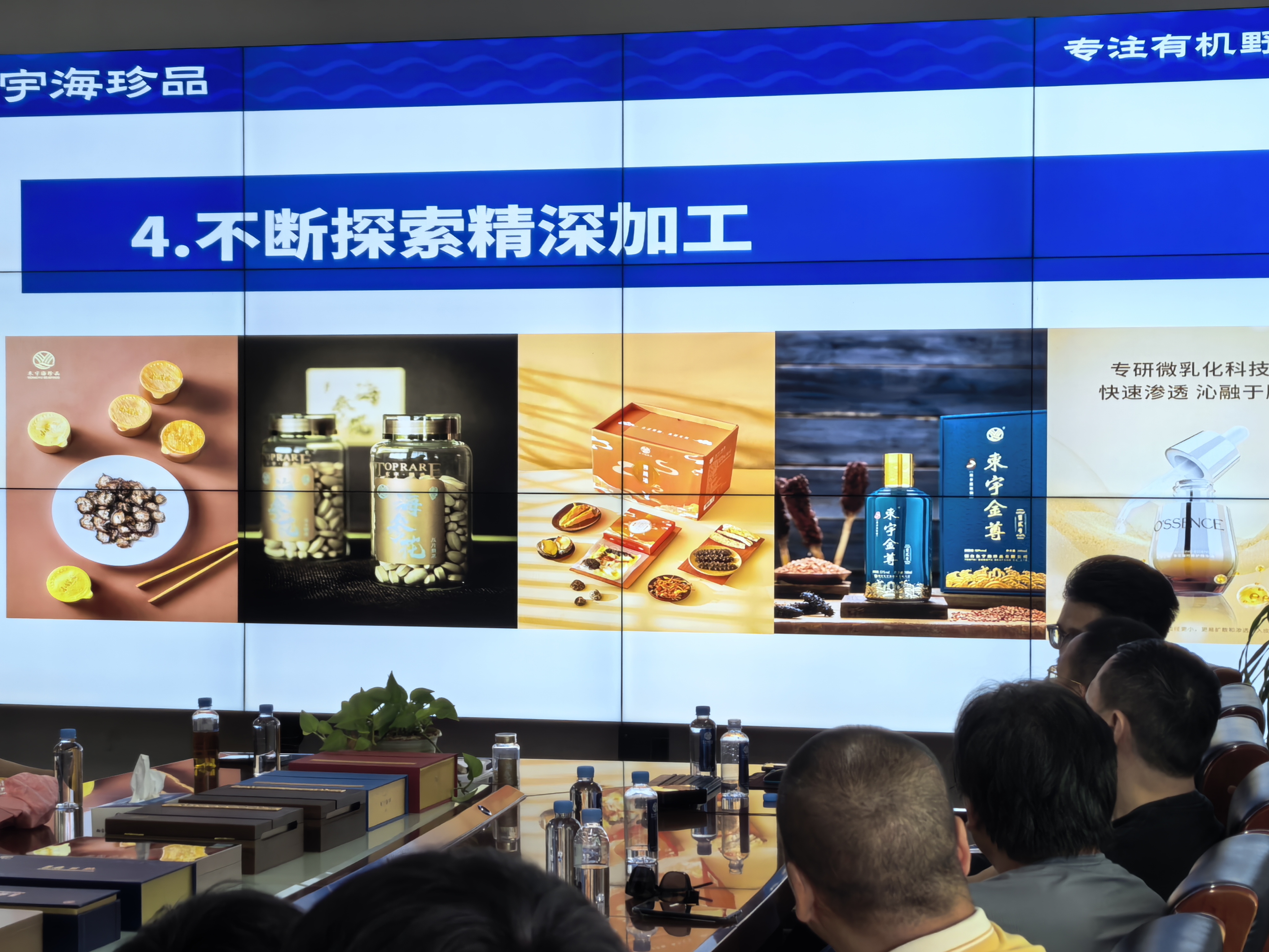 在烟台东宇海珍品总部,考察团一行与企业管理层进行了座谈交流。东宇研发部总经理李铁鹏系统介绍了企业由传统渔业向“海洋经济+科技+文旅”模式转型的全过程,并重点介绍了海参深加工产品的研发与市场拓展经验。他提到,东宇通过与高校、科研机构合作,开发海参花压片、海洋活性多肽面膜等高附加值产品,延伸产业链条,年产值已突破5亿元。